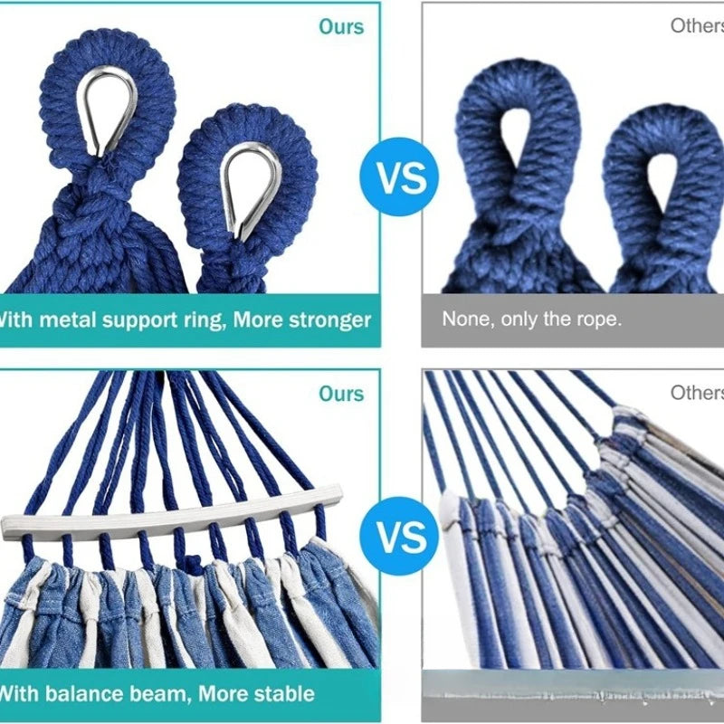 Hamacul din Pânză este conceput cu bare de răspândire din lemn curbat, rezistente, pentru a preveni rostogolirea, oferindu-ți ție și partenerului tău o experiență de relaxare stabilă și confortabilă. Fabricat din pânză durabilă, este respirabil, moale și suficient de puternic pentru a susține două persoane. Perfect pentru camping, grădini din curte, terase sau excursii la plajă.